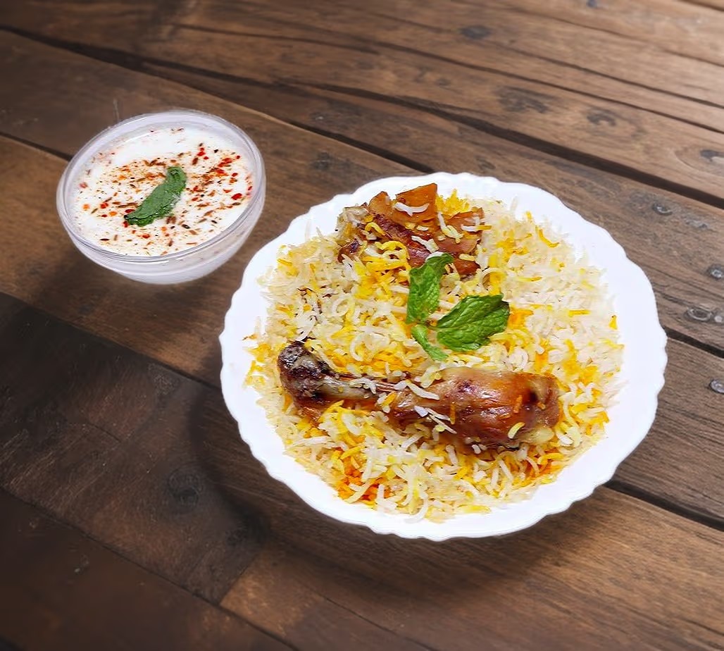 A royal and authentic biryani made with tender chicken, aromatic saffron, and an exquisite blend of spices. Cooked in Desi Ghee, its golden hues and rich flavors offer an unforgettable indulgence, served with refreshing Zeera Raita.